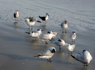 Again, I was thrilled. A fellow beach walker stopped me and said "Did you see the skimmers?" So I'm not alone in my delight at their return. The pair at the back share the beach with an assortment of Royal Terns, Sandwich Terns and gulls who seem to be preening at the return of their strange-billed friends.